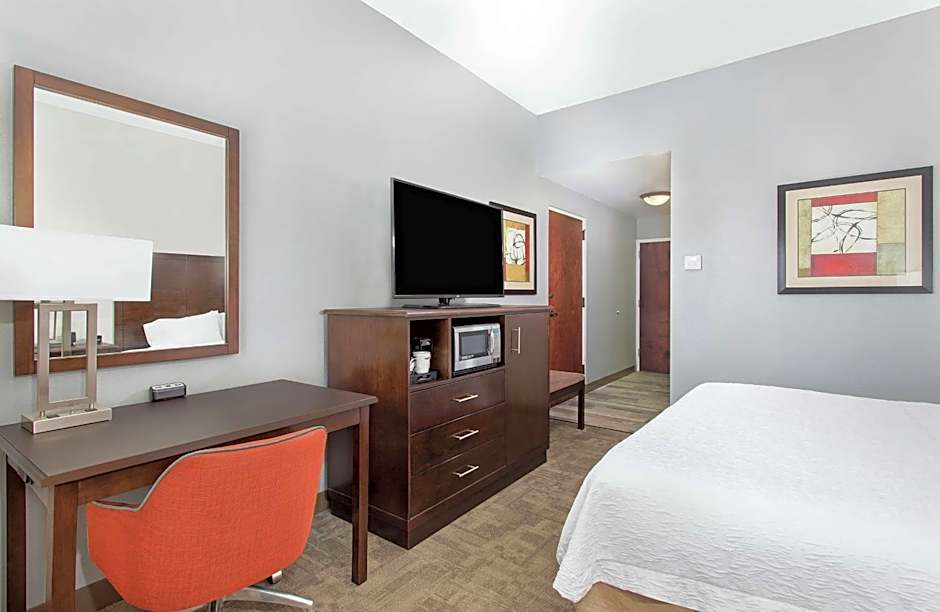 This accessible room features a roll-in shower, visual alarm, microwave, and refrigerator.